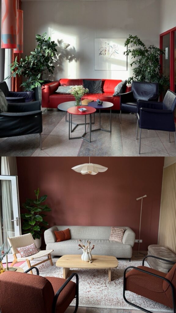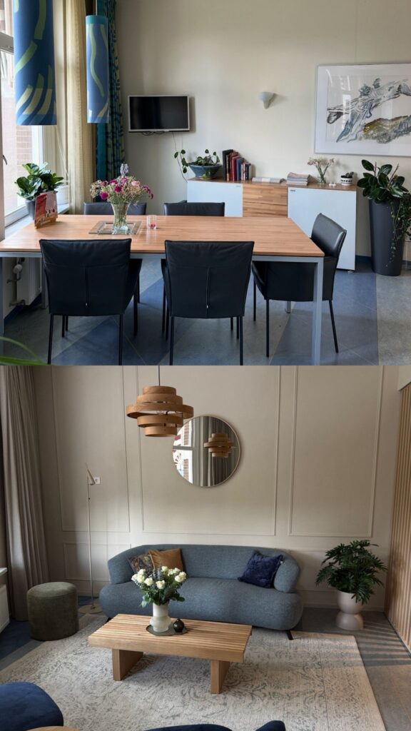 Hieronder een kijkje in de vernieuwde huiskamers van Hospice Kuria. Bovenkant van de foto, de situatie zoals deze ‘was’ en onderkant zoals deze nu ‘is’.